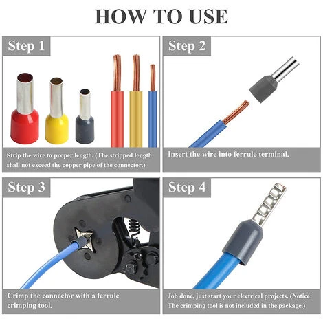 Étapes de travail: Dénudez d’abord le fil et insérez-le dans le serre-câble. Utilisez ensuite un outil de sertissage professionnel pour sertir les embouts et les fils avec l’embout pour démarrer votre projet électrique.
