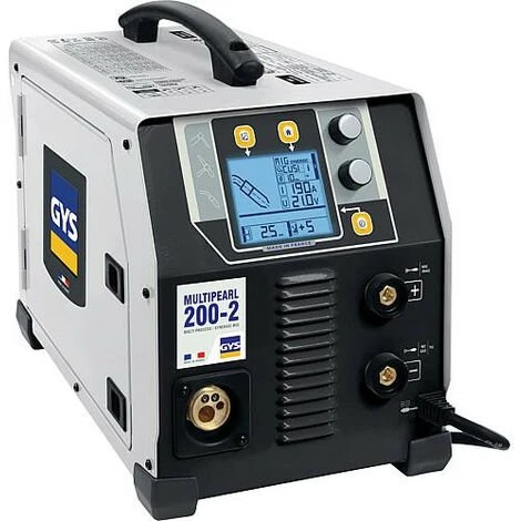 Poste de soudure multiprocédé monophasé avec régulation synergique pour utilisation en mode MIG/MAG Possibilité de soudage TIG grâce à la technique moderne Ce poste associe 4 procédés de soudure au confort de la technologie inverter et dun écran LCD MIG/MAG – Pour entraîner des bobines de ø 100 et ø 200 mm- Ce procédé est réglable en manuel ou en synergique- Les fonctions SPOT et DELAY sont disponibles TIG -Le passage au soudage TIG s´effectue par appui sur le bouton – Avec amorçage TIG LIFT- Réglage de l´évanouissement de l´arc en descente progressive d´intensité de courant en fin de soudage ainsi que du post-gaz via la touche TIG à connecteur EURO ÉLECTRODES – Convient pour toutes les éclectrodes courantes à enrobage basique, rutile, inox, fonte jusqu’à 5 mm de diamètre- Les fonctions HOT START et ARC FORCE sont réglables de 0 à 100% SYNERGIES EN MIG-MAG -Lajustement de la vitesse fil et de la tension est calculé automatiquement en renseignant le type et le diamètre du fil , lépaisseur à souder, le gaz utilisé , la position de soudage-Il est possible dintervenir manuellement sur la vitesse fil et la longueur darc pour affiner les réglages Avantages-Son écran a été spécialement développé pour permettre de visualiser et dintervenir facilement sur chaque élément- POWER FACTOR CORRECTION (PFC) : optimise la puissance de soudage et exploite au mieux le réseau électrique permettant déconomiser de lenergie- FLEXIBLE VOLTAGE Le Flexible Voltage permet le fonctionnement automatique sur une alimentationde 85V à 265V-Lassociation de ses deux technologies lui permet dêtre utilisable sur rallonge de chantier jusquà 100m ou sur prise européenne