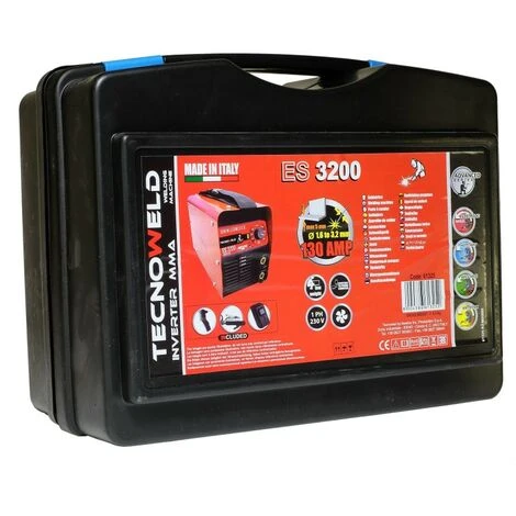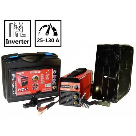 Poste à souder INVERTER 130 AMPERES ES3200 .Courant de soudage réglable de 5 à 130 A. Equipé de la technologie ANTI-STICK, anti-collage de l’électrode, qui arrête le flux électrique afin que l’électrode ne colle au travail. Le temps de refroidissement est réduit grâce au système de ventilation HOT FORCE. Tension à vide U0 de 90 V Amorçage immédiat. Idéal pour des travaux de maintenance et de réparation et usage régulier. Il permet de souder toutes les baguettes de soudure en inox, fonte et acier jusqu’à 3.2mm. Pack spécial avec CAGOULE DE SOUDAGE RED AWELCO protection 9/13 à déclenchement automatique Livré avec une mallette et différents accessoires : masque à main, pinces de masse, porte électrode, marteau, brosse et sangle de transport. L’appareil est composé d’un transistor IGBT (Insulated Gate Bipolar Transistor) présentant une faible tension de déchet, et de commuter d’importants courants. Le poste à souder est compatible avec les groupes électrogènes inférieurs à 6.2 kVA et est résistant aux chocs.