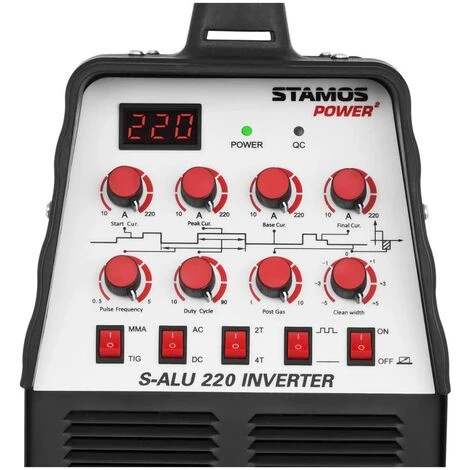 Grâce au poste à souder S-ALU- 220 de Stamos Power, vous disposez désormais d’une machine professionnelle pour pouvoir souder manuellement et en WIG (TIG). Ce poste à souder des plus performants vous permet de travailler avec du courant continu ou avec du courant alternatif, et ce en fonction du métal. Avec le courant alternatif (C.A.), il est possible de traiter des alliages légers comme de l’aluminium ou du titane. Le courant continu (C.C.) peut être utilisé pour souder des métaux plus robustes comme l’acier, l’inox, le cuivre voire le laiton. La fonction Pulse permet d’apporter plus de courant, sans augmenter significativement la température du matériau. Grâce à elle, le poste à souder S-ALU- 220 de Stamos Power vous permet de réaliser des soudures propres et précises, et ce surtout sur les matériaux les plus délicats. En plus du soudage WIG (TIG), il est également possible d’effectuer des soudures avec des électrodes enrobées. De plus, il vous est possible d’utiliser le poste dans des chantiers de constructions et d’en avoir un usage mobile grâce aux bonnes performances de l’inverseur intégré dans l’appareil.