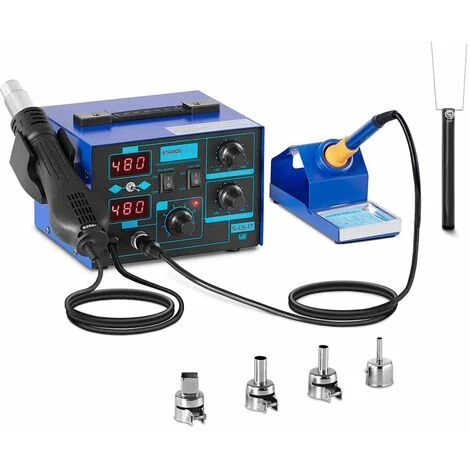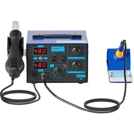 Cette station de soudage numérique a été conçue notamment pour des activités industrielles comme les réparations ou la construction. Elle convient également pour le loisir d’utilisateur expérimenté en électronique. La structure compacte et les poignées ergonomiques de la station la rendent mobile et surtout économe en place. Évidemment, toutes les stations de soudage de Stamos Soldering ESD sont fiables et sûres! L’alimentation électrique de l’appareil est connectée à la base de la station dans laquelle vous pouvez trouver tous types de fonctions et raccords dont vous avez besoin. De plus, elle dispose de deux écrans LED qui affichent les températures des deux outils (fer à souder et buse à air chaud). De plus, la station de soudage S-LS-17 Basic est équipée d’un support latéral pour la buse à air chaud. La buse à air chaud, d’une puissance de 650 Watts, est tant adaptée pour souder des éléments montés en surface que pour les dessouder (SOIC, CHIP, QFP, PLCC, BGA, SMD) et ce, via la technique d’air chaud propulsé. La résistance intégrée du fer à braser vous garantit une transmission de chaleur des plus efficaces. Doté de 75 Watts de puissance, ce fer à souder vous permettra de produire avec aisance des connexions mécaniques fiables. Grâce à la résistance intégrée, la chaleur est directement transmise à la panne de soudure et garantit une répartition optimale de la chaleur. Le fer à souder est équipé d’un dispositif particulier qui permet d’aspirer instantanément les fumées de soudures. La prise en main ergonomique et agréable du fer à souder vous permet de travailler avec précision et en tout confort. Le socle et son éponge sèche permettent de ranger le fer à souder ainsi qu’à nettoyer la panne de soudure.