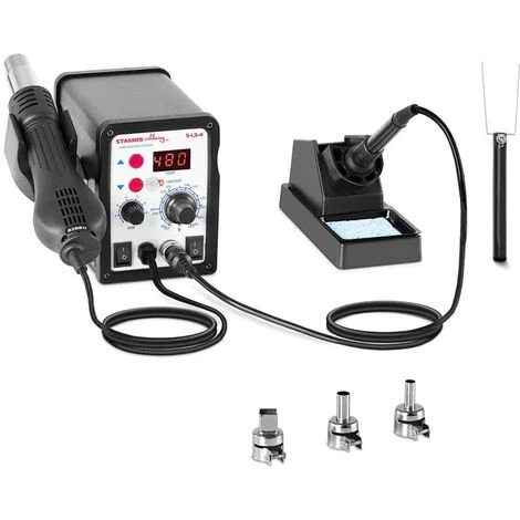 Cette station de soudage numérique a été conçue notamment pour des activités industrielles comme les réparations ou la construction. Elle convient également pour le loisir des utilisateurs expérimentés en électronique. La structure compacte et les poignées ergonomiques de la station la rendent mobile et surtout économe en place. Évidemment, toutes les stations de soudage de Stamos Soldering ESD sont fiables à 100% ! L’alimentation électrique de l’appareil est connectée à la base de la station dans laquelle vous pouvez trouver tous types de fonctions et raccords dont vous avez besoin. De plus, la station de soudage dispose d’une écran LED de haute qualité qui indique avec exactitude la température d’activité de la buse à air chaud. Ainsi, gagnez du temps en vérifiant immédiatement la conductivité de vos soudures grâce au tensiomètre intégré. De plus, la station de soudage S-LS-4 est équipée d’un support latéral pratique pour la buse à air chaud et d’un support à fer à souder muni d’une éponge sèche. Ainsi, vous pouvez aisément prendre et déposer vos outils. La buse à air chaud d’une puissance de 650 Watts convient tant pour le brasage standard que pour le brasage de Composants Montés en Surface (CMS), qui nécessite une technologie de séchage à l’air chaud. La résistance intégrée du fer à braser vous garantit une transmission de chaleur des plus efficaces. Ainsi, grâce au régulateur manuel d’air chaud, vous pouvez ajuster, avec une grande facilité, le débit que vous souhaitez tout en vous référant aux indications affichées sur l’écran LED de la station.