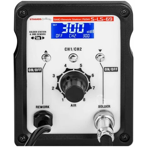 La station de soudage S-LS-69 de Stamos Soldering met à disposition un fer à souder et un pistolet à air chaud. Elle vous offre tout ce dont vous avez besoin, notamment pour les travaux de brasage et de réparation impliquant des composants CMS. Ce modèle avec écran LCD séduit par une facilité d’utilisation élevée, doublée d’un confort de soudage inégalé. Son fer à souder efficace de 50 W fonctionne sur une plage de 200 à 480 °C et présente une stabilité en température de ±2 °C, tandis que son pistolet à air chaud de 750 W est idéal pour le soudage et le dessoudage, étant donné qu’il présente une température de service de 100 à 500°C et un débit d’air variable allant jusqu’à 120 l/min.